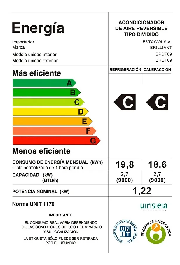 Descubre el Aire Acondicionado Brilliant 9000 BTU On/Off BREC09, una solución eficiente para mantener un ambiente cómodo en tu hogar u oficina. Con una capacidad de refrigeración de 9.000 BTU, este aire acondicionado ofrece un consumo energético optimizado, con un EER de 2.81 y un COP de 3.22, lo que garantiza un rendimiento eficaz. Su diseño compacto, con dimensiones interiores de 76 x 35 x 28 cm, y un peso ligero de 7 kg, facilita su instalación. Además, cuenta con un nivel de ruido de solo 40/51 dB(A), asegurando un funcionamiento silencioso. Este modelo utiliza gas R-410, un refrigerante ecológico, para asegurar un bajo impacto ambiental. Perfecto para quienes buscan una climatización eficaz, el BREC09 es la elección ideal para cualquier espacio.
